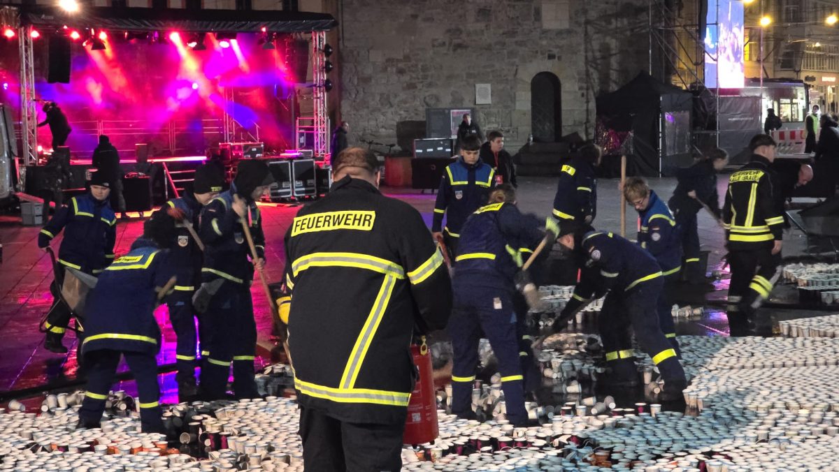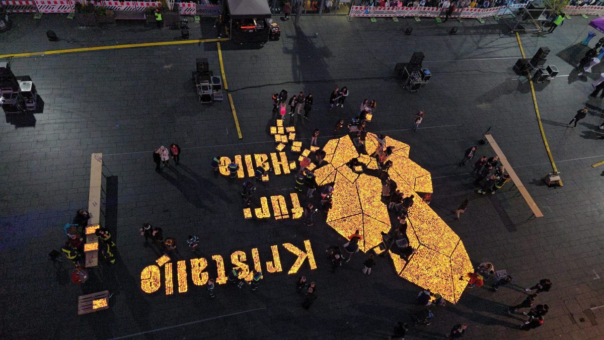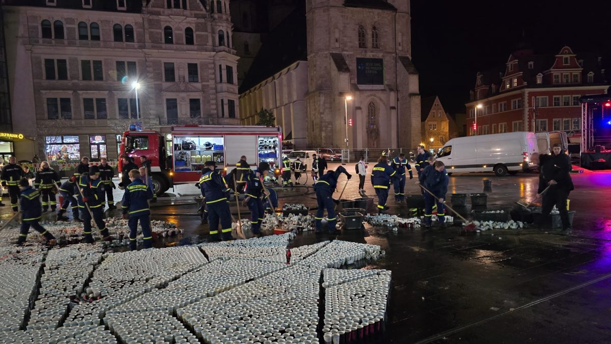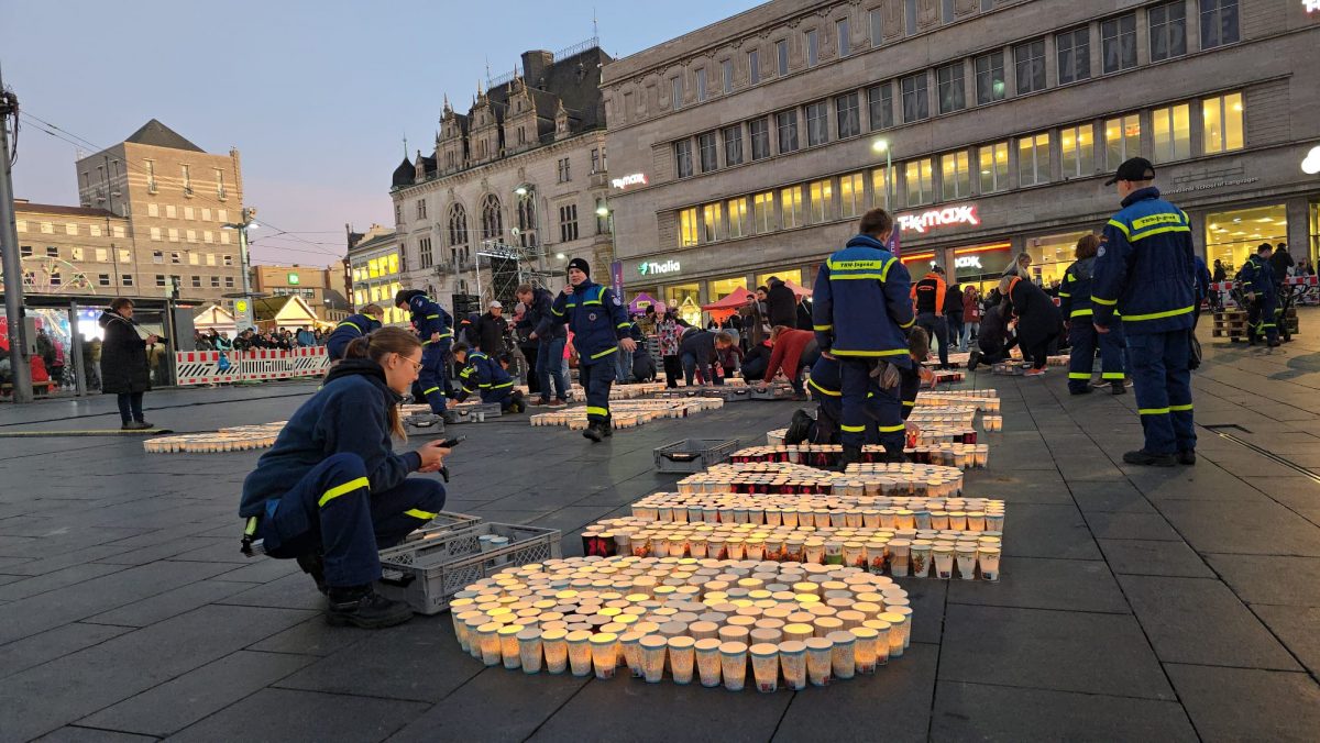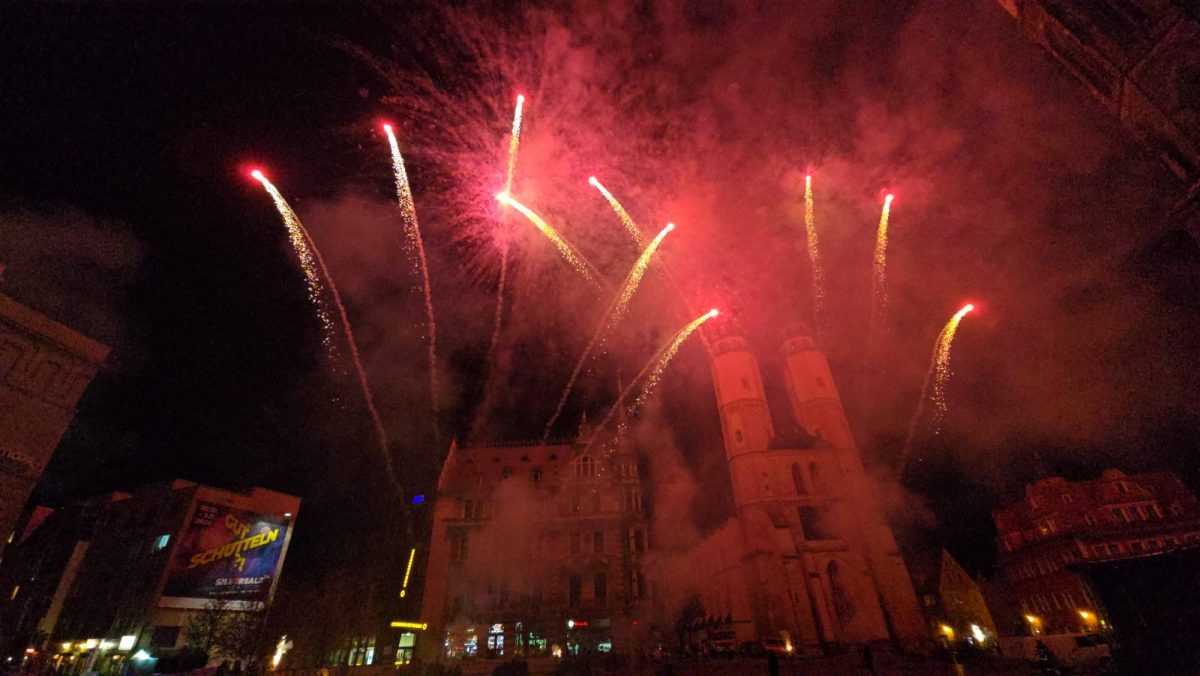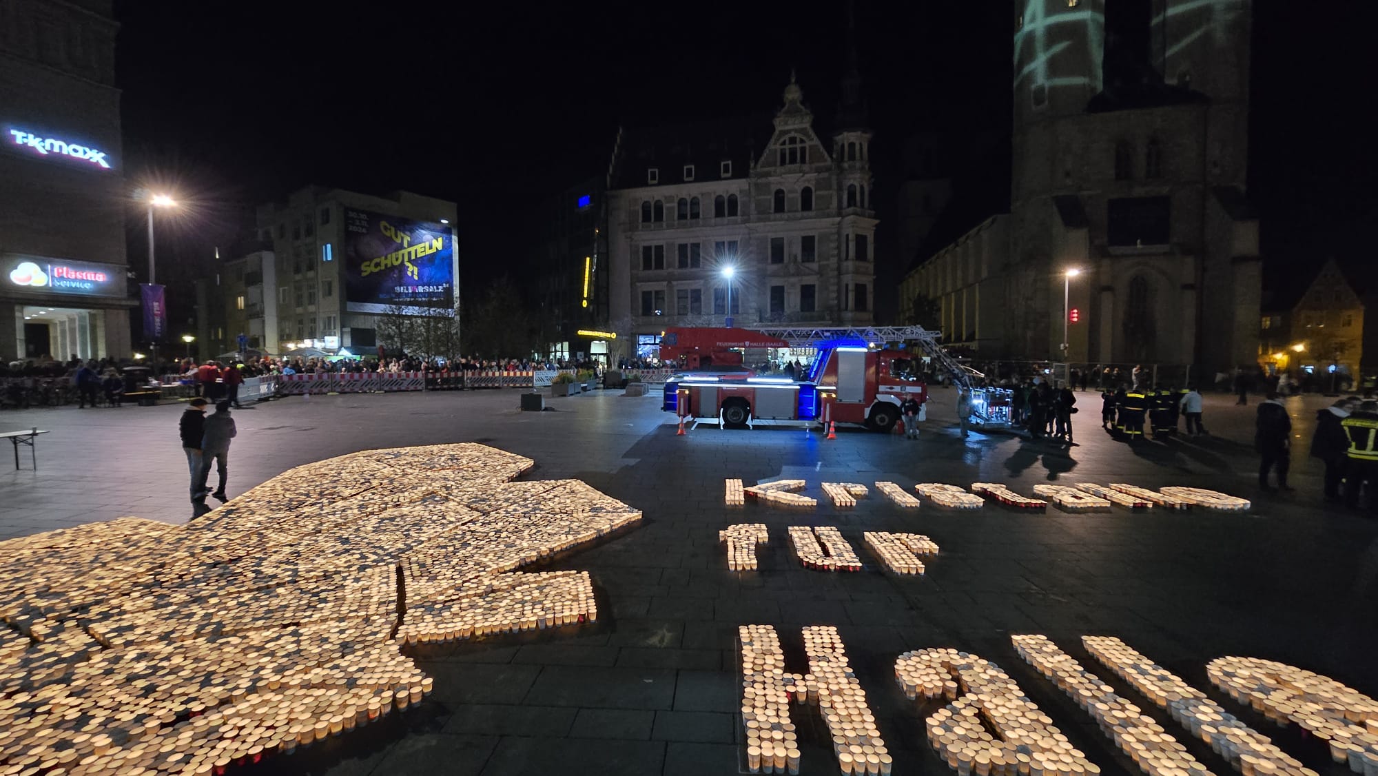 Sonntag entstand auf dem Marktplatz ein Lichterbild. 11.846 Teelichter leuchteten und bildeten den Schriftzug “Kristalle für Halle” und einen stilisierten Salzkristall. Aud der Bühne standen unter anderem die Uni-Bigband und Opernsänger Claus Ostertag. Zum Abschluss zündete Bombenschmidt noch sein Feuerwerk.