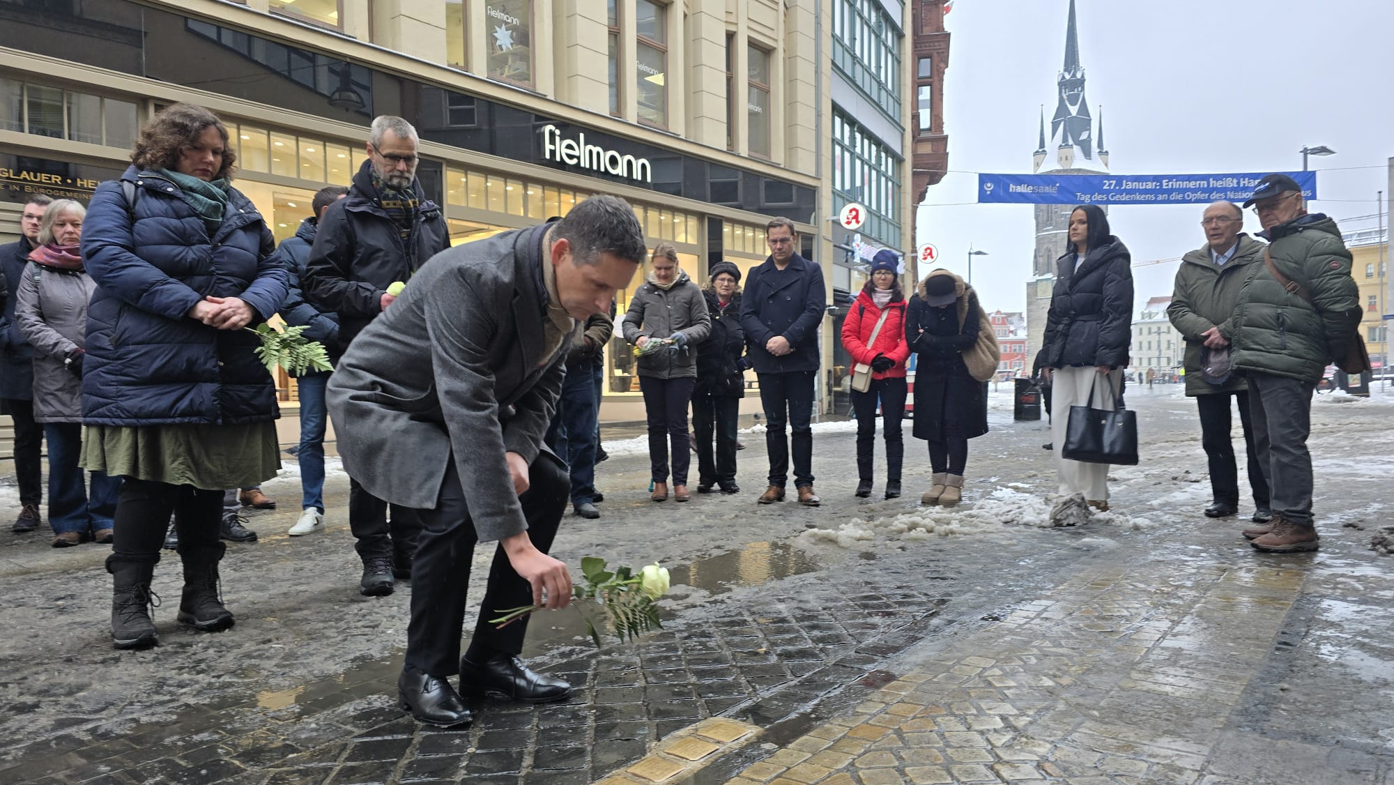 Oberbürgermeister Dr. Alexander Vogt verwies auf die inzwischen 303 Stolpersteine in Halle, die an frühere Bewohnerinnen und Bewohner erinnern – „Menschen, die hier lebten, denen das Zuhause genommen wurde“. Die Stolpersteine seien ein zentraler Bestandteil der Erinnerungskultur der Stadt. Zugleich betonte Vogt die Notwendigkeit, antisemitischen Bestrebungen entschieden entgegenzutreten.