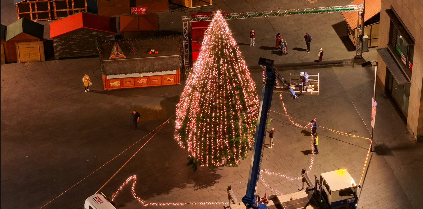 Am 25. November wird der hallesche Weihnachtsmarkt eröffnet. Schon jetzt erfolgt der Aufbau. Und nach dem am gestrigen Mittwoch der Bau aufgestellt wurde, folgte am Donnerstag bereits die Lichterkette. Laut Stadt ist sie 1.200 Meter lang und verfügt über 2.400 Lichtpunkte. Es handelt sich dabei um eine völlig neue Lichterkette.