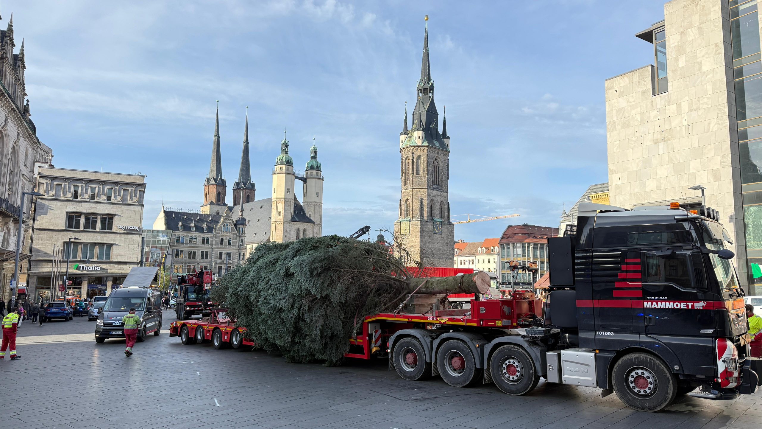Weihnachtsbaum in der Frohen Zukunft für den Weihnachtsmarkt in Halle (Saale) wurde gefällt