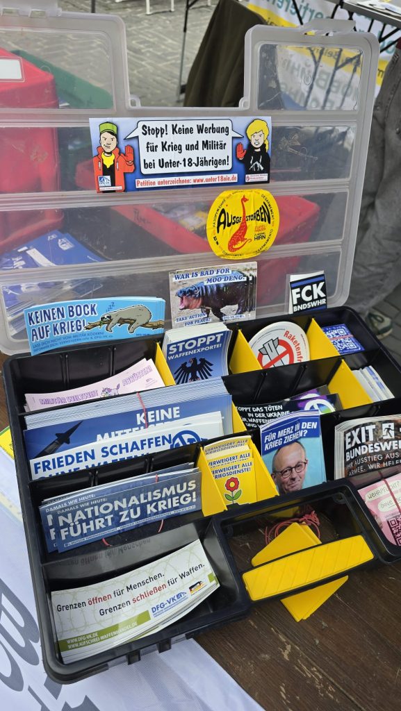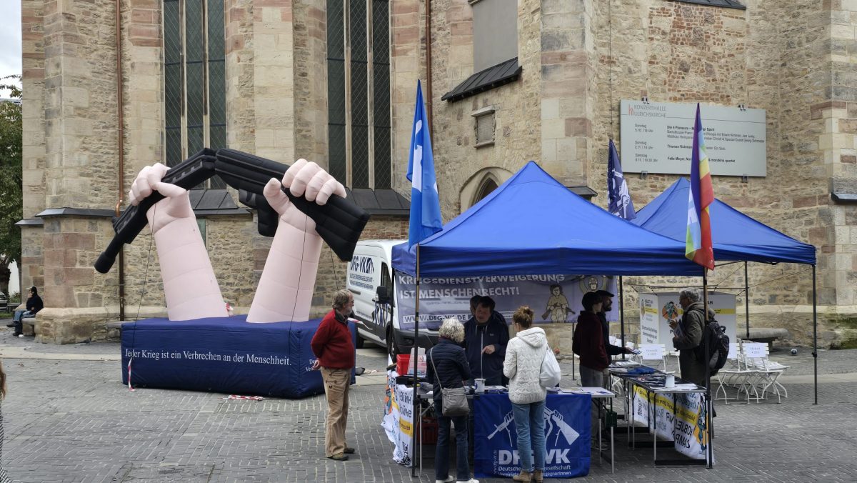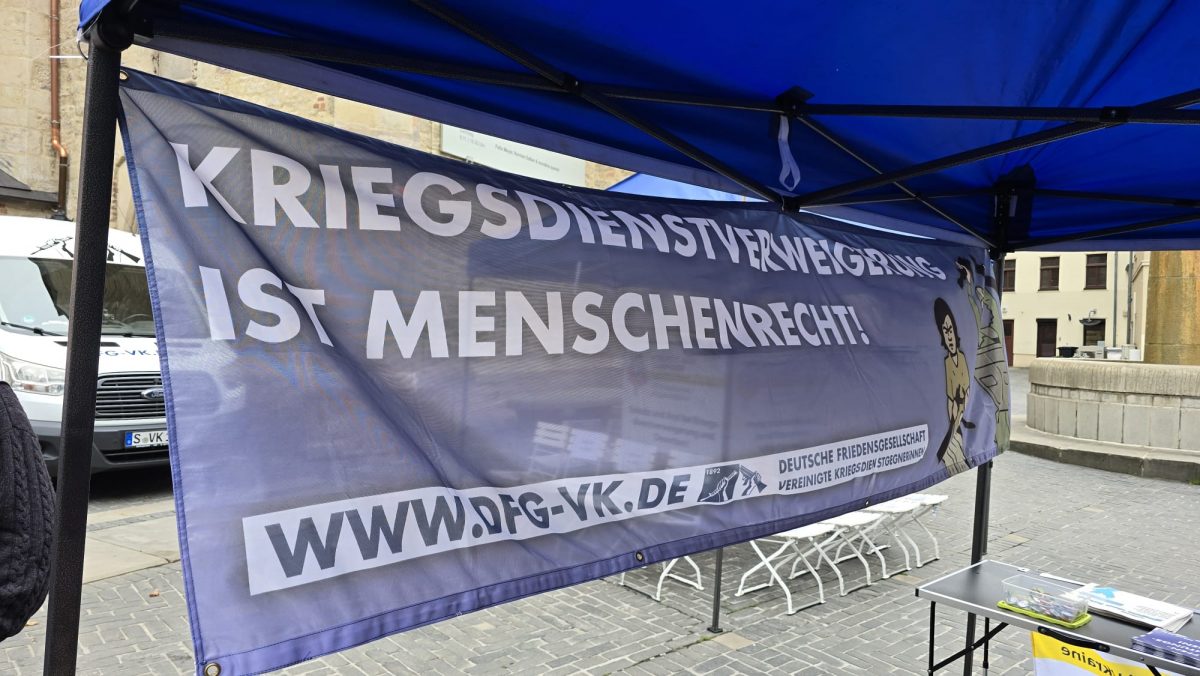 Im Rahmen einer bundesweiten Informationstour hat die Deutsche Friedensgesellschaft – Vereinigte KriegsdienstgegnerInnen (DFG-VK) am Samstag Station in Halle gemacht. Ziel der Aktion war es, insbesondere junge Menschen auf ihr Grundrecht zur Kriegsdienstverweigerung aufmerksam zu machen – ein Recht, das laut der Friedensorganisation zunehmend in Vergessenheit geraten ist.