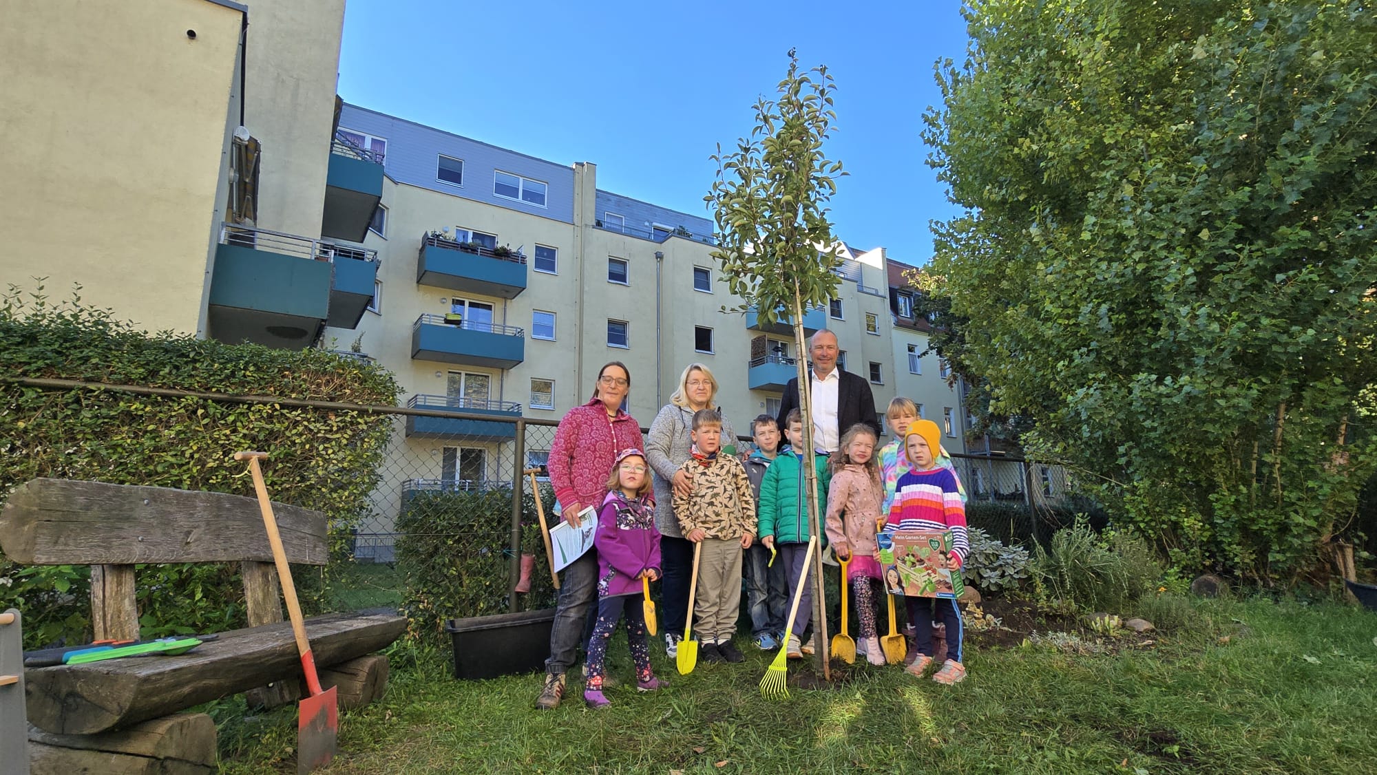 EVH pflanzt mit Kindern Birnenbaum an der Kita Eigen-Sinn – Kunden bekommen ab sofort einen Gutschein für einen Baumkauf