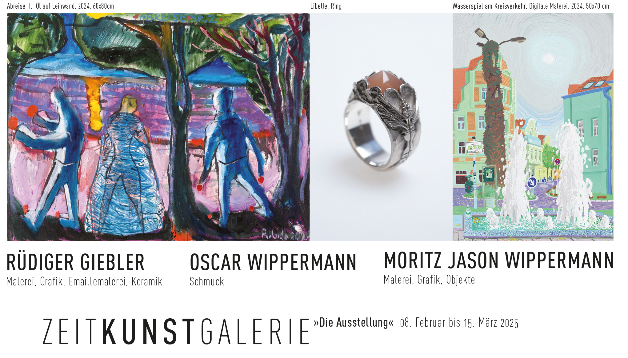 Vom 08. Februar bis 15. März 2025 ist in der Zeitkunstgalerie in der Kleinen Marktstraße „Die Ausstellung“ zu sehen. Gezeigt werden Rüdiger Giebler (Malerei, Grafik, Keramik), Oscar Wippermann (Schmuck) sowie Moritz Jason Wippermann (Malerei, Grafik, Objekte)