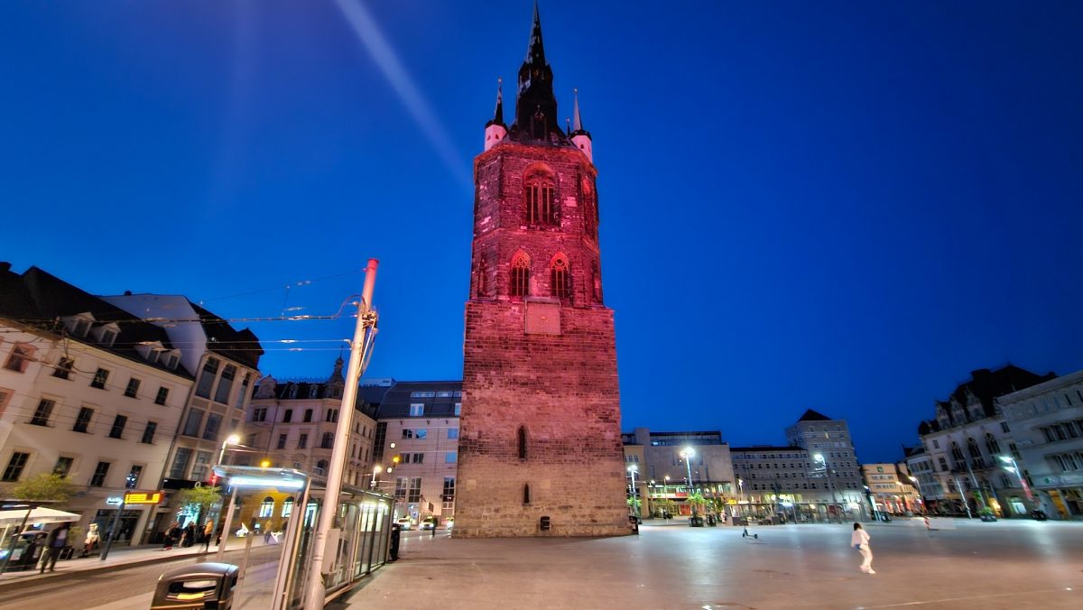 Doch die bei Halle-Besuchern beliebte Fotokulisse mit leuchtendem Händel-Denkmal, Marktkirche und Rotem Turm fällt in diesem Jahr aus.